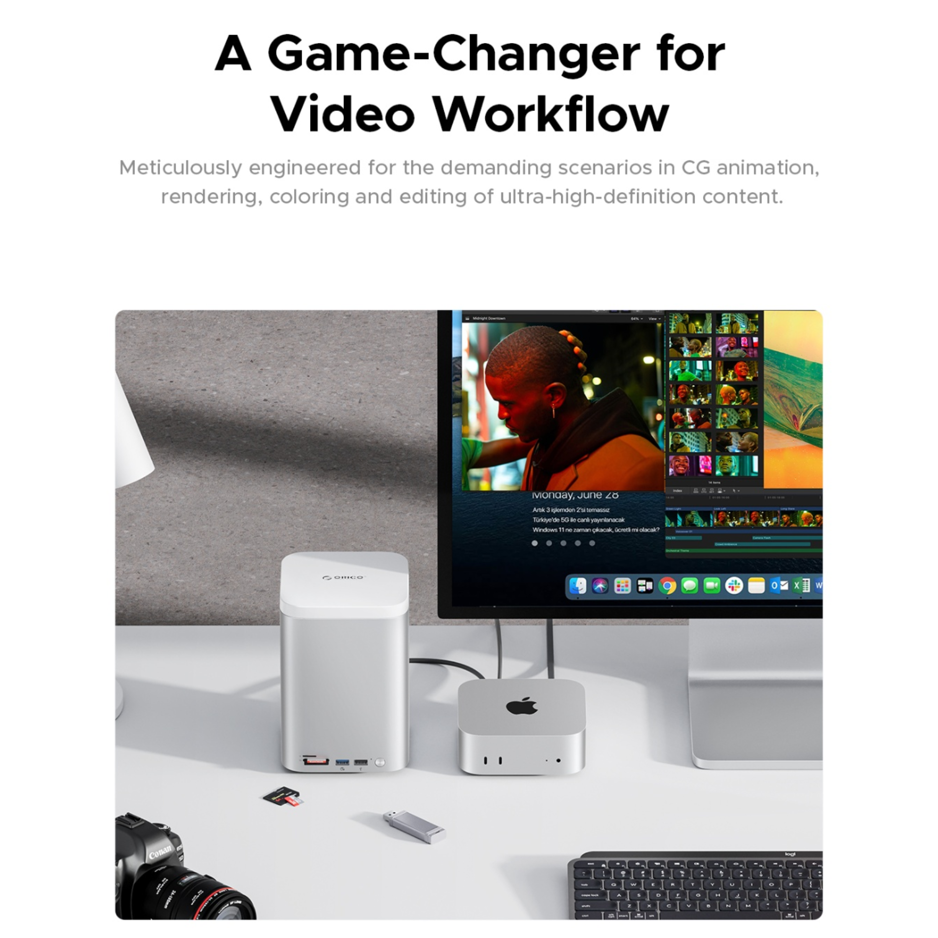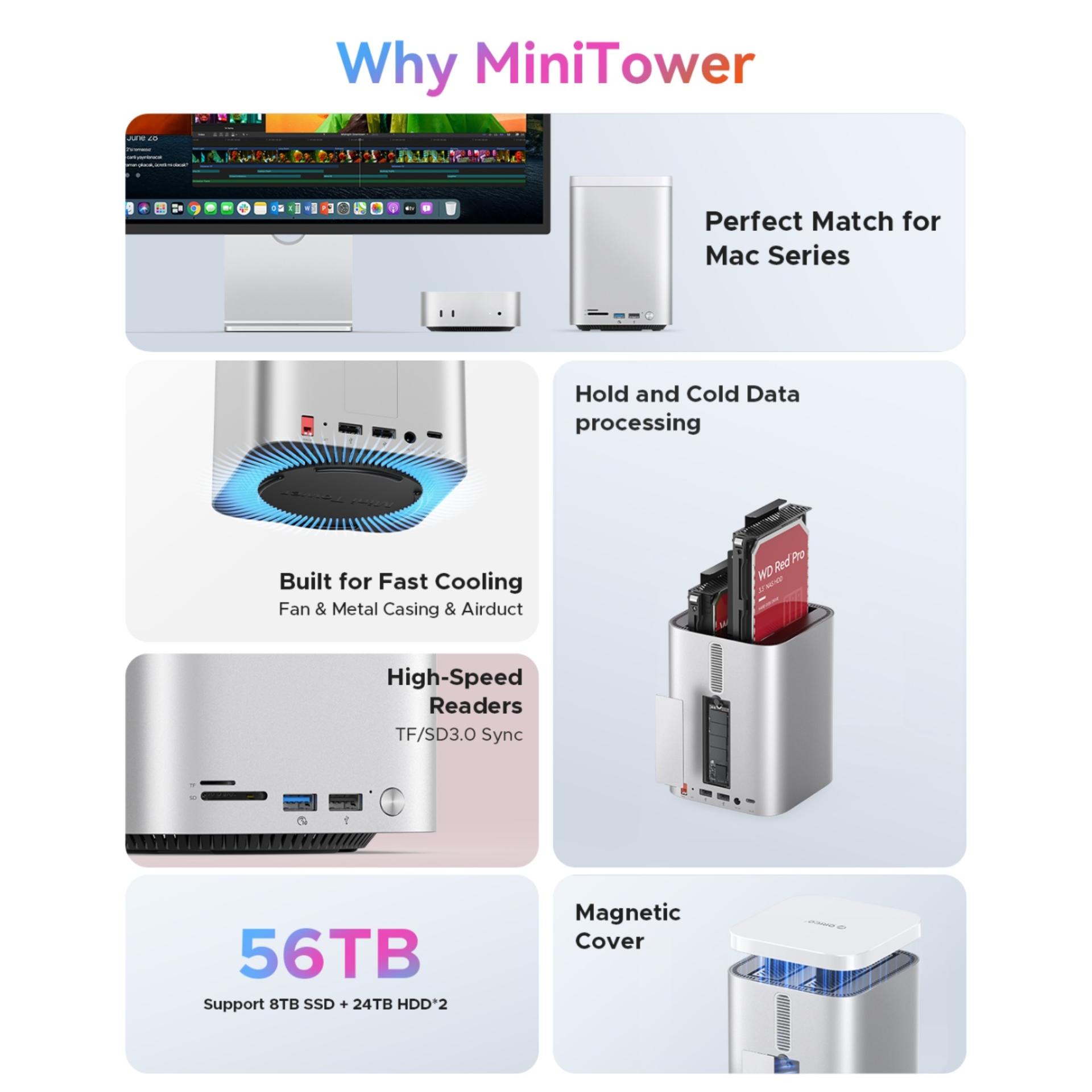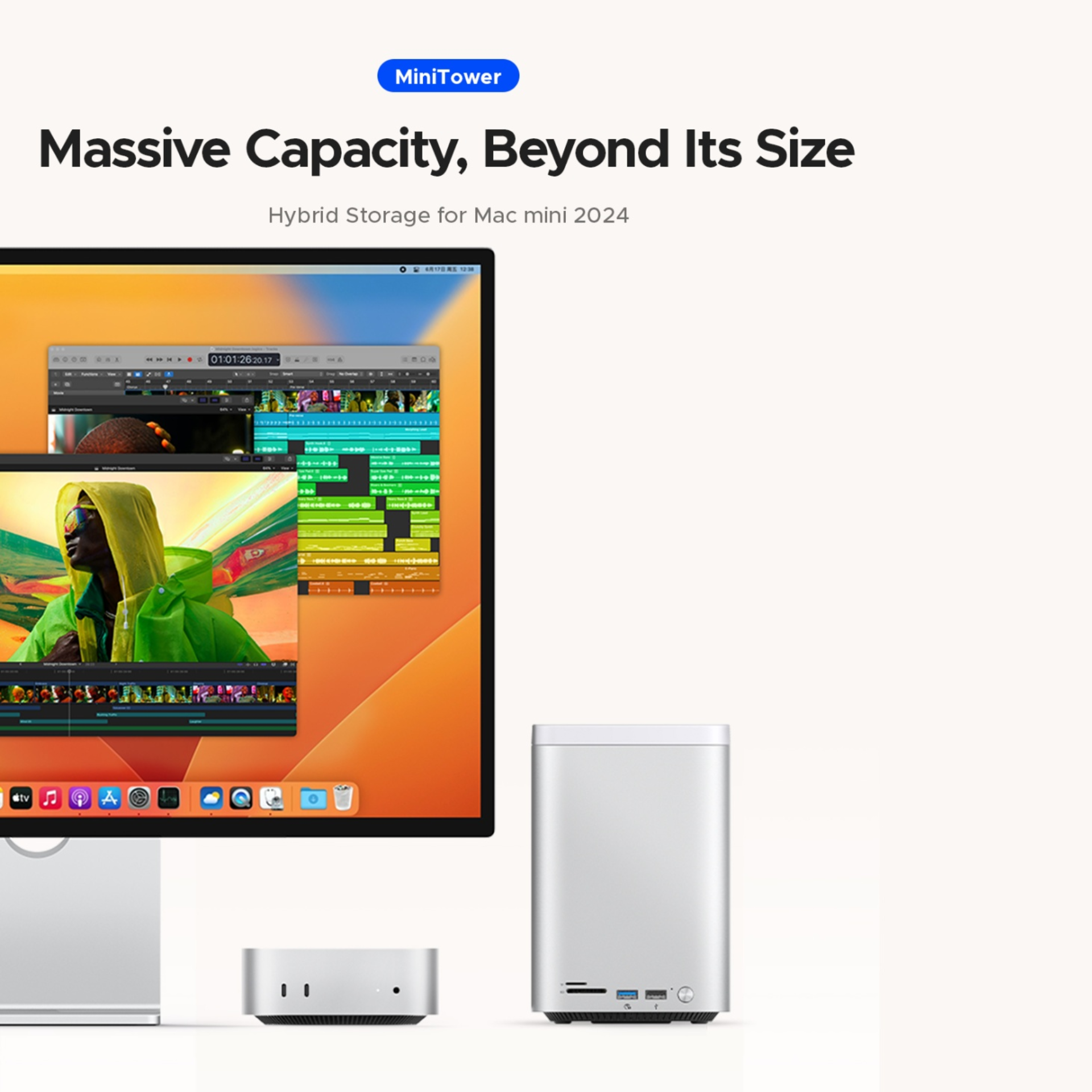 , nút nguồn và nút RAID riêng biệt. Thiết kế vỏ nhôm bạc sang trọng, đồng bộ hoàn hảo với Mac mini, phù hợp cho người dùng sáng tạo và chuyên nghiệp cần hiệu suất cao và đa kết nối.